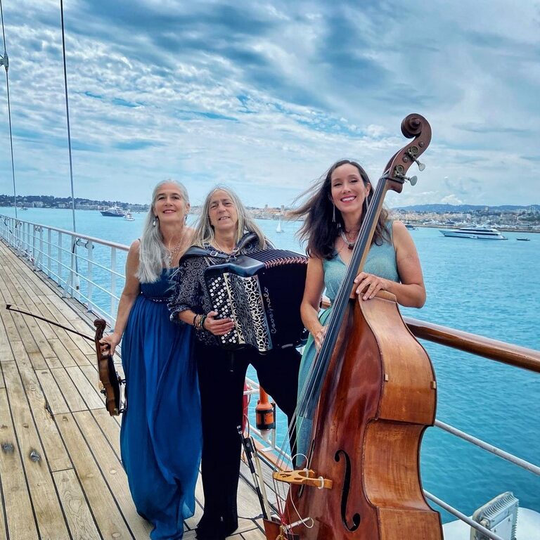 Trois femmes au violon, accordéon et contrebasse. Nous jouons de la musique du monde entier. Notre répertoire couvre les mélodies françaises, italiennes, russes, américaines, tziganes, juives en passant par le folklore irlandais, scandinave et de l’Europe de l’Est ainsi que le jazz et la musique classique.